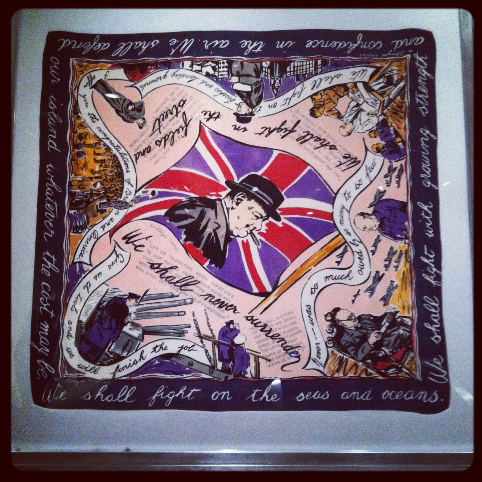 My favorite scarf in the exhibit featured Winston Churchill the Prime Minister of England and prominent leader during World War II. The rayon scarf was printed around 1943 and manufactured by Filmyra Fabrics in a wide variety of color schemes.