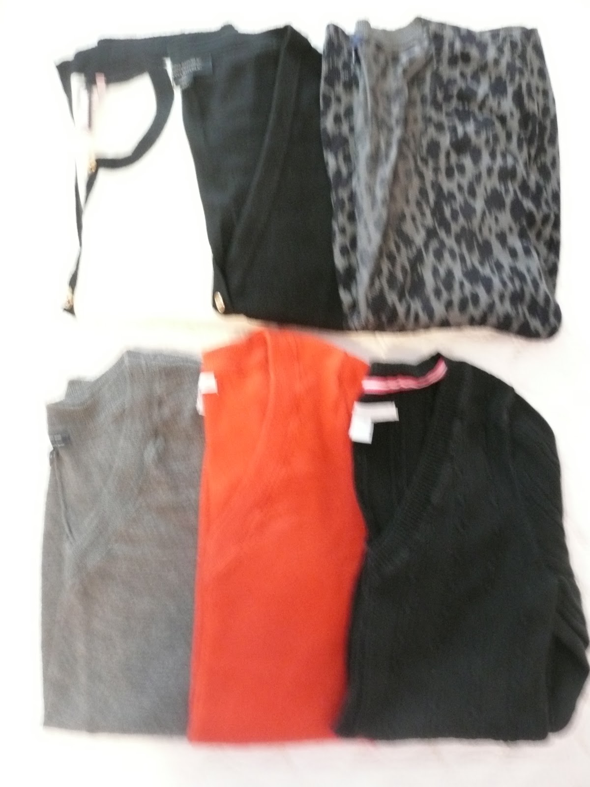 | One grey knit pullover One wool cardigan One green striped sweater |
