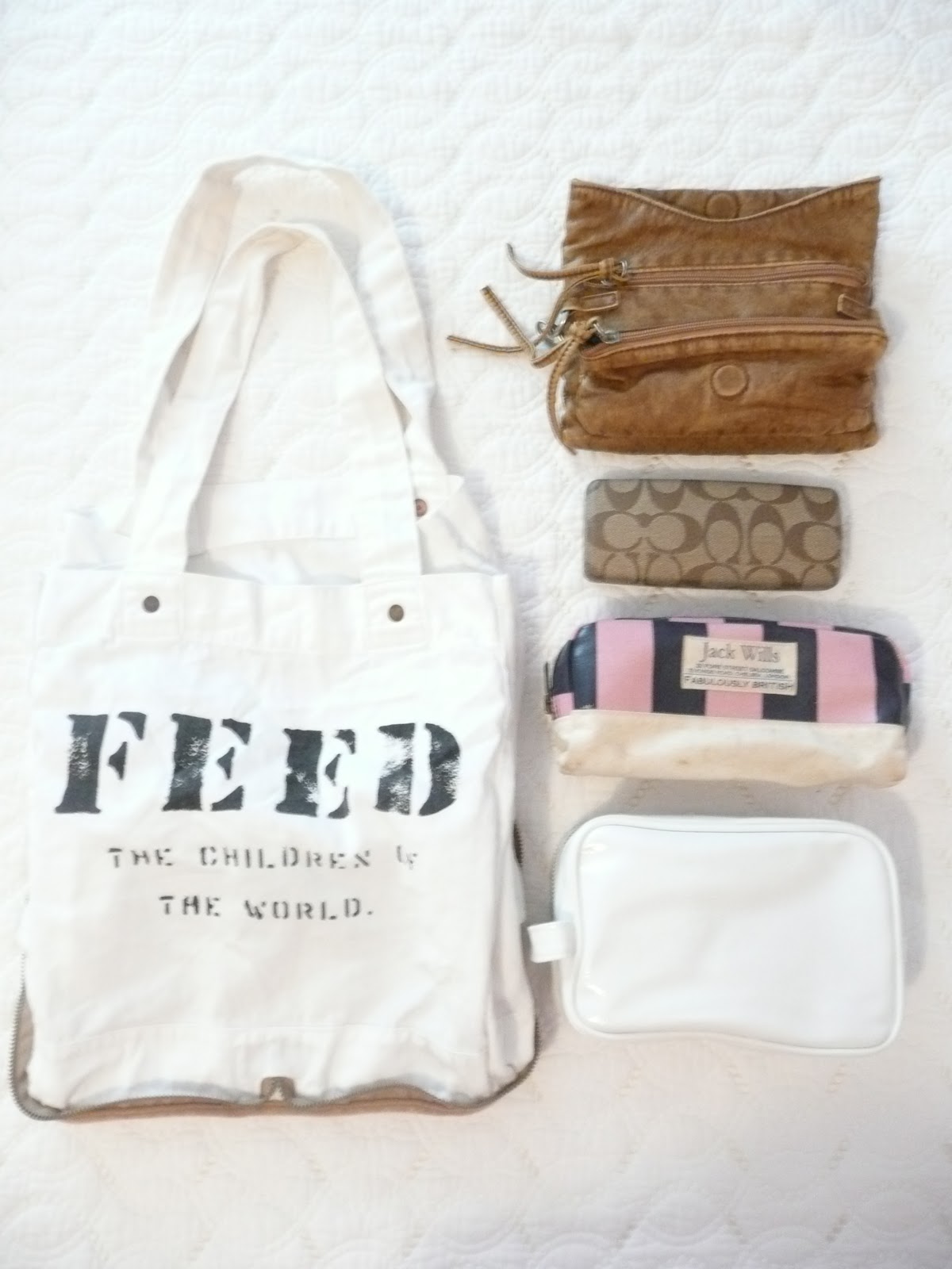 | One tote bag/book bag One pencil pouch Reading glasses Make up bags |