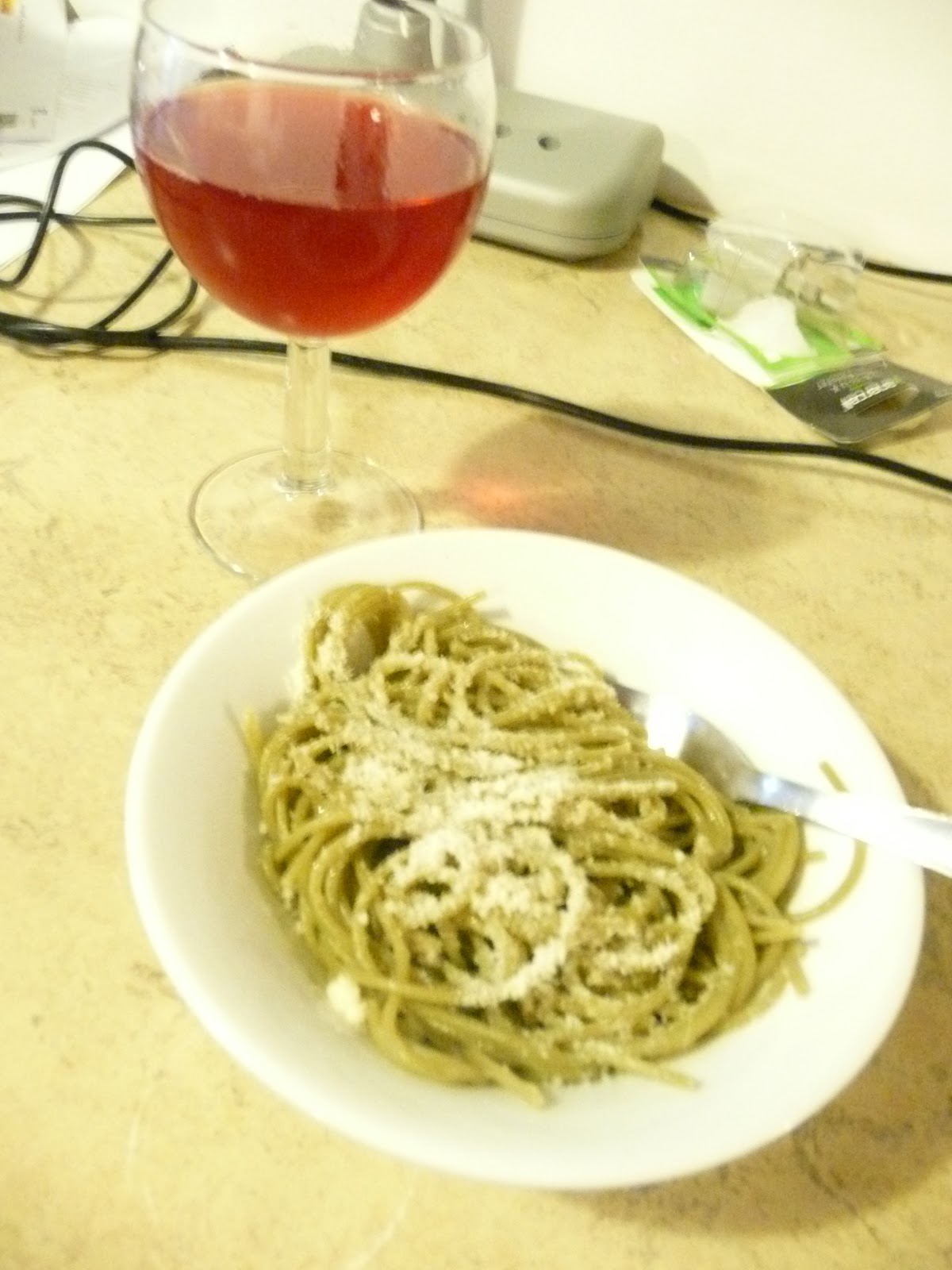| Organic Spinach Spaghetti with extra virgin olive oil and Parmesan cheese served with cranberry juice |