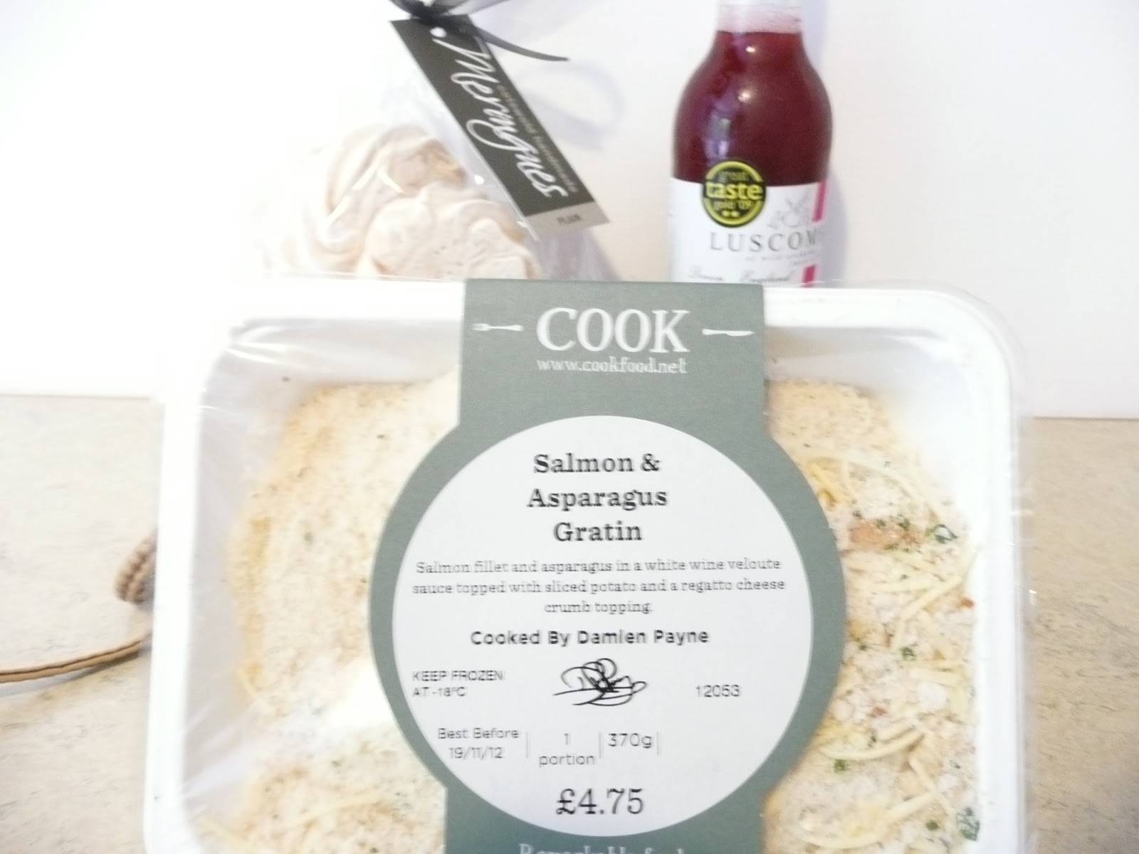 | Meringues, raspberry lemonade, and Salmon & Asparagus Gratin from Cook |