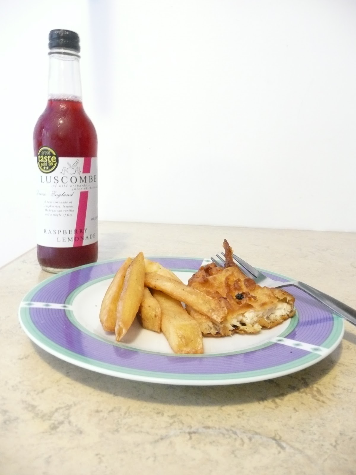 | Fish and chips leftovers from Eagle and Child served with Luscombe raspberry lemonade |