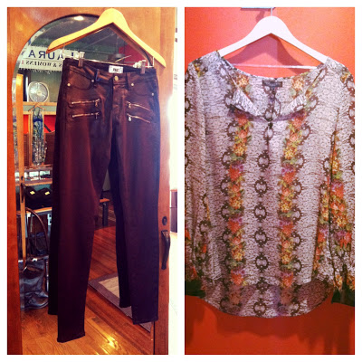 | Skinny silk coated pants by Paige and an edgy floral top by Sanctuary, both available at Laura Jean Denim Shop |