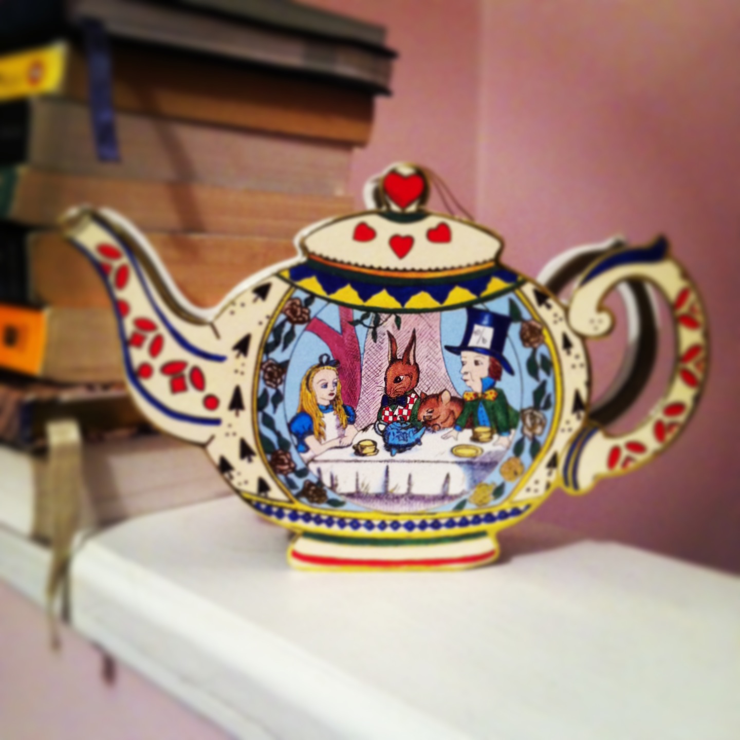| An excerpt from Alice in Wonderland on the back of the teapot: “There was a table out under a tree, and the March Hare and the Hatter were having tea; a Dormouse sat between them, fast asleep. The table was large, but they were all crowded together at one corner. ‘No room!’ they cried out when they saw Alice coming. ‘There’s plenty of room!’ she said indignantly, and she sat down at the table.”