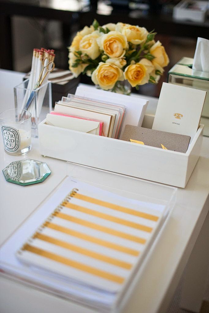 My office is coming along–I have already brought some books and binders from home. I don’t know if I could keep up with fresh flowers at the office, but I love the organization ideas using different boxes, bins and trays.