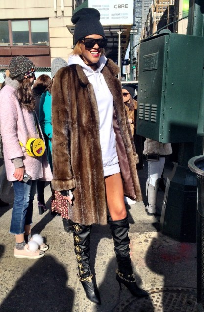 There was one moment when everyone held their breath looking at one particularly beautiful woman. With her long, tan legs, bright smile and sexy, slightly irreverent outfit (a sweatshirt, fur coat and high heeled boots couldn’t have looked hotter), she shared a striking resemblance to Rihanna.