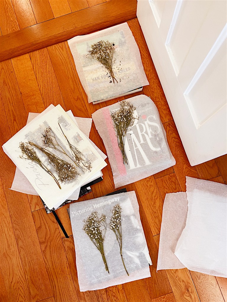 5. Let the flowers press for 3 weeks. After Week 3, add more weight on top of the stack and let the flowers press for an additional 2 weeks.