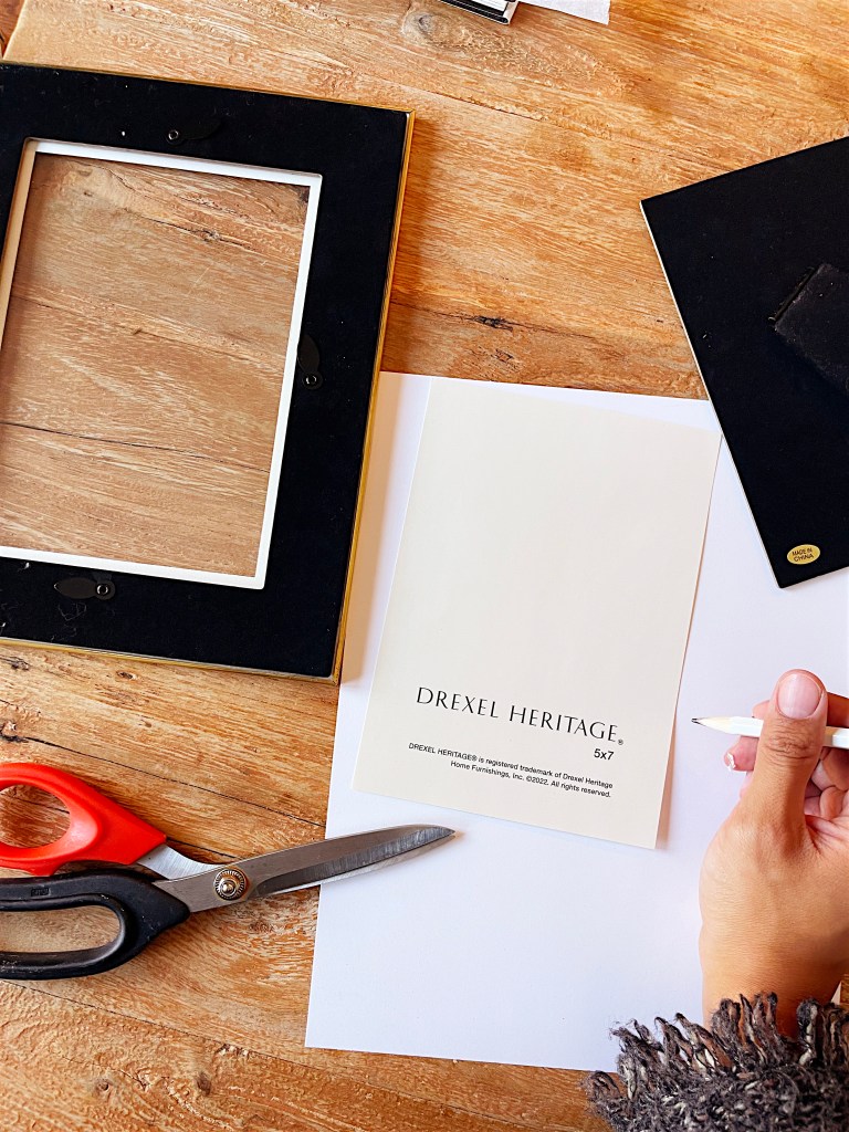 2. Open the frame, remove the frame insert, then trace the frame insert on cardstock for the backing of the pressed flowers. Before proceeding, double-check and make sure that the cardstock fits in the glass.