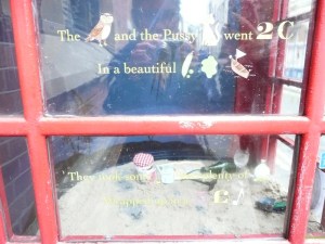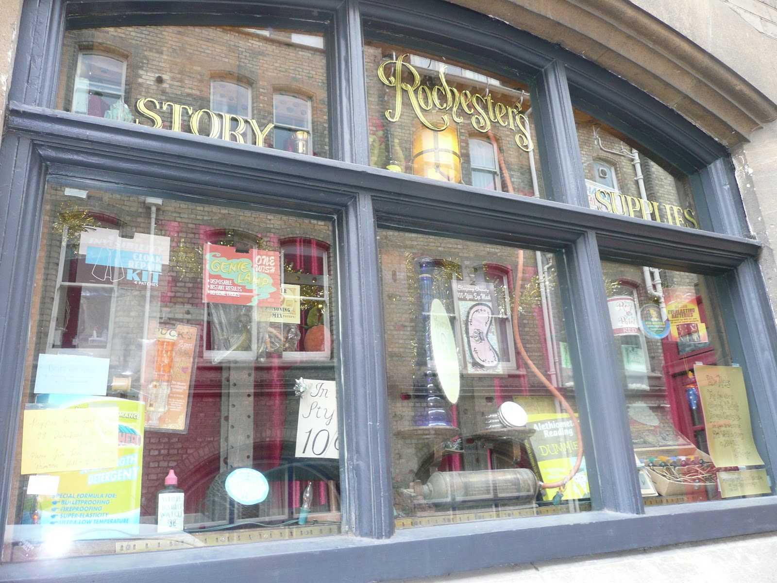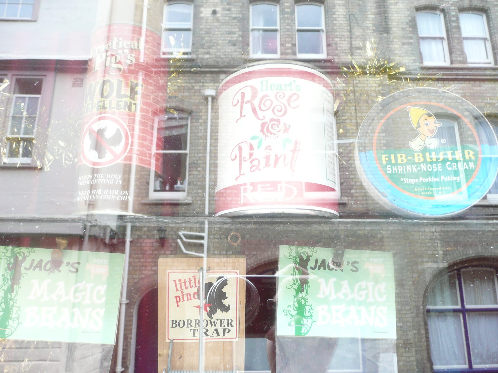 We looked at the telephone booth more closely and there was a strange display of toys on a sandy beach. The store window next to it read Rochester’s Story Supplies–and it really is a souvenir shop of fairy tale toys from various childhood fiction. The window displayed a Little Pinch Borrower’s Trap (The Borrowers), Jack’s Magic Beans (Jack and the Beanstalk), Fib-Buster Shrink Nose Cream (Pinocchio), and Practical Pig’s Wolf Repellent (The Three Little Pigs).