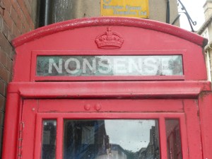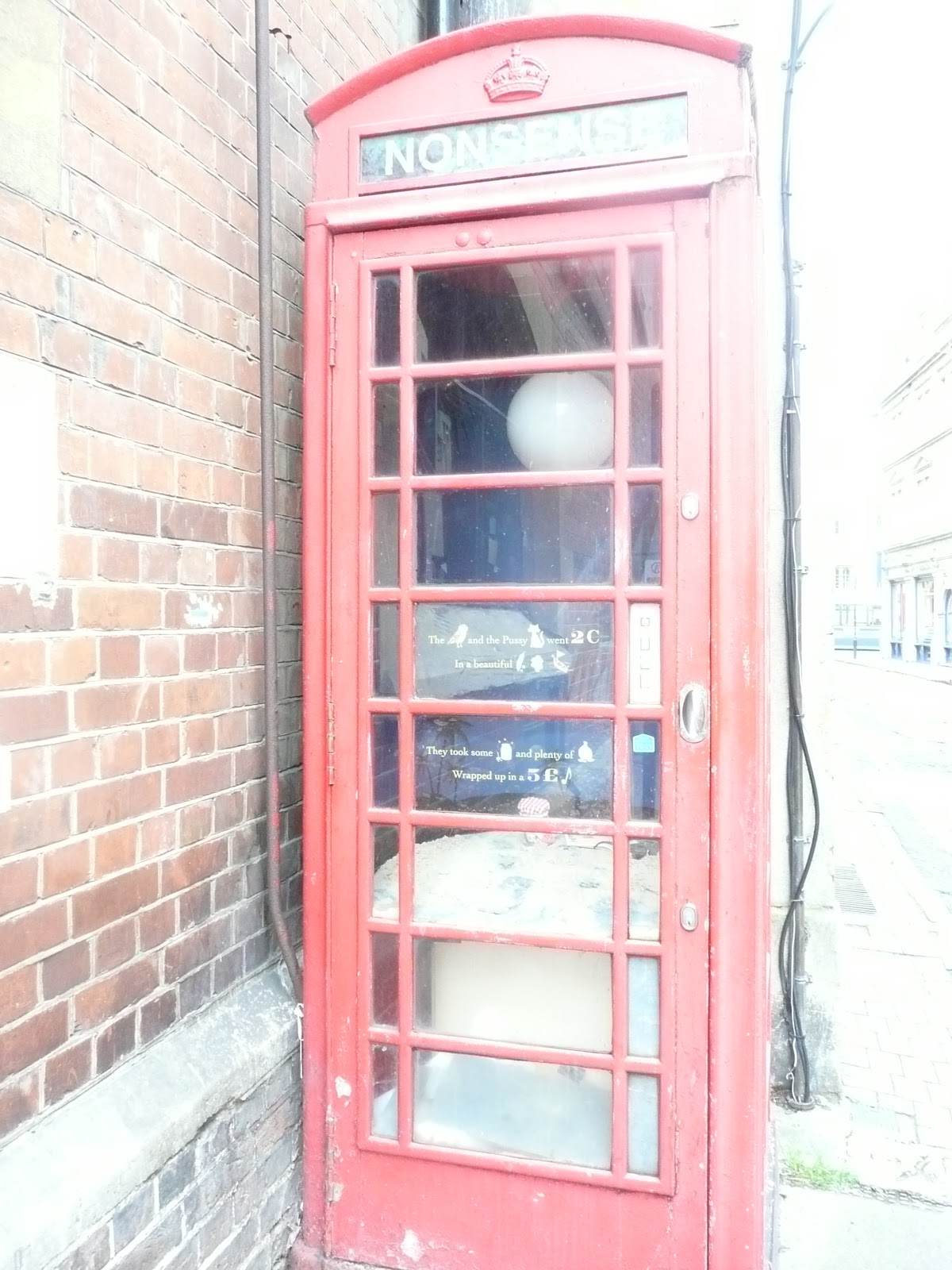 I hung out with a friend downtown today and we went to Starbucks, Christ Church, Alice’s Shop, and Primark. At one point, we found ourselves on the most peculiar street. We left Alice’s Shop and headed towards the Westgate Shopping Center when we found a red telephone booth. Red telephone booths are not uncommon in England, but what struck us about this one was that instead of having “TELEPHONE” on top of it, it read “NONSENSE.”