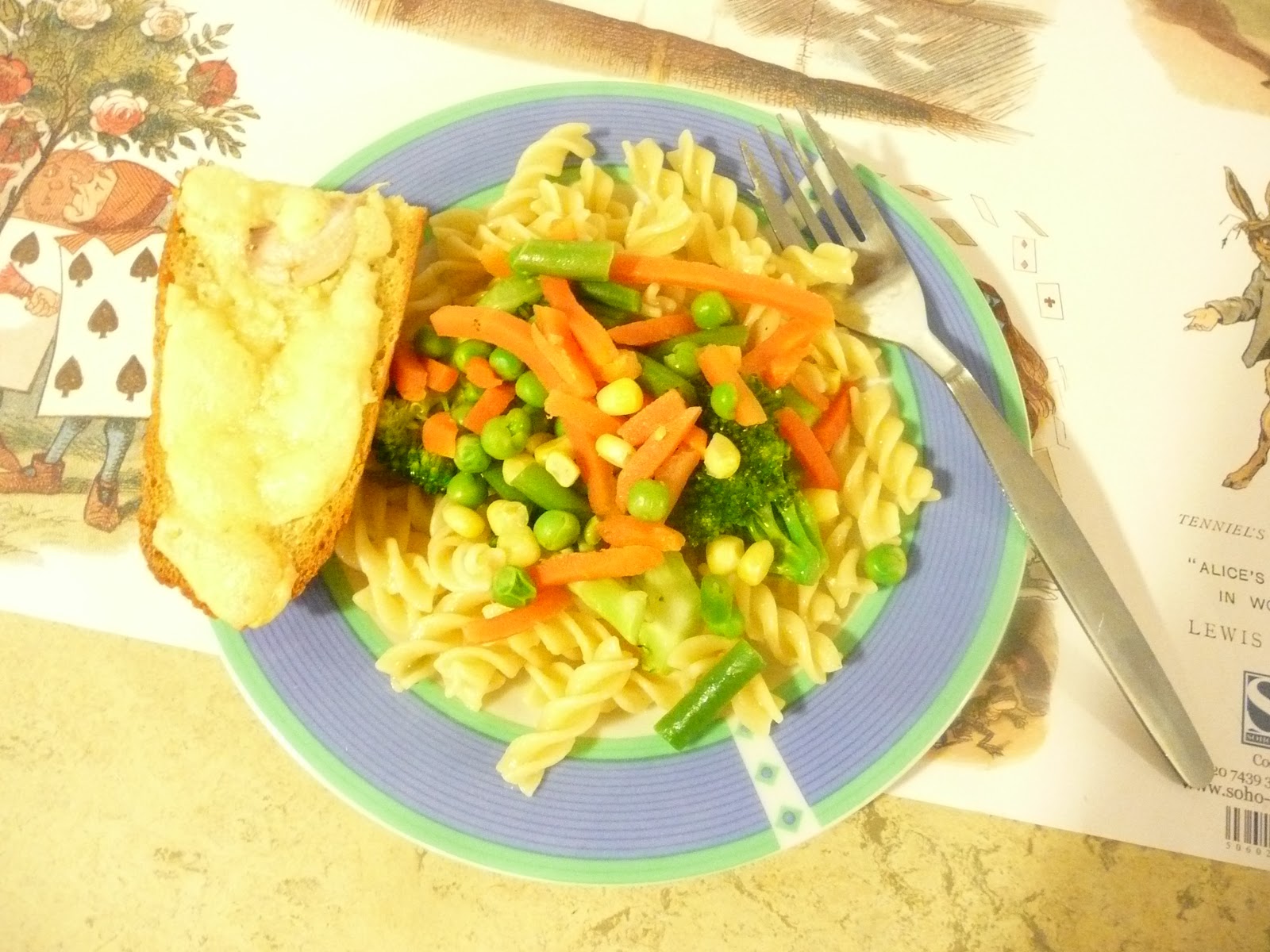 For dinner, we made pasta with steamed vegetables served with mozzarella cheese on baguette bread.