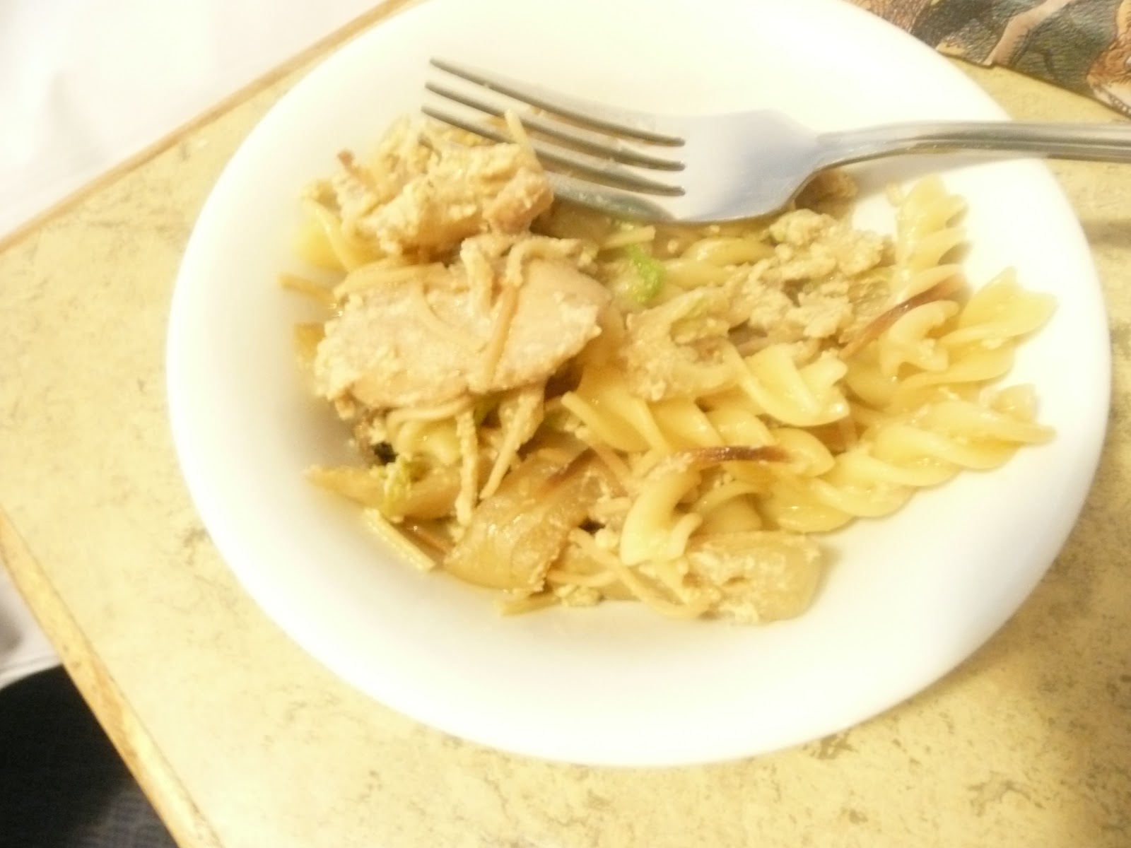 For dinner, I mixed leftovers of Spicy Chicken Chow Mien with plain fusilli pasta and cooked it on the stove. Trust me, it is not something I would do normally, but for the sake of trying to balance my food budget, it worked out pretty well.