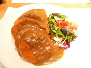 Yasai Katsu Curry–“sweet potato, aubergine, and butternut squash deep-fried in panko breadcrumbs, served with a curry sauce and sticky white rice. garnished with dressed mixed leaves and red pickles.”