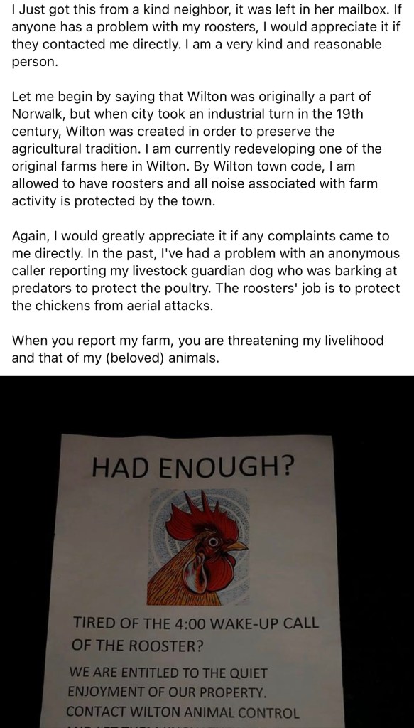 Take this Facebook post from several years ago near my old neighborhood—a passive-aggressive battle fought through printed flyers in mailboxes about someone’s rooster only happens in the suburbs.